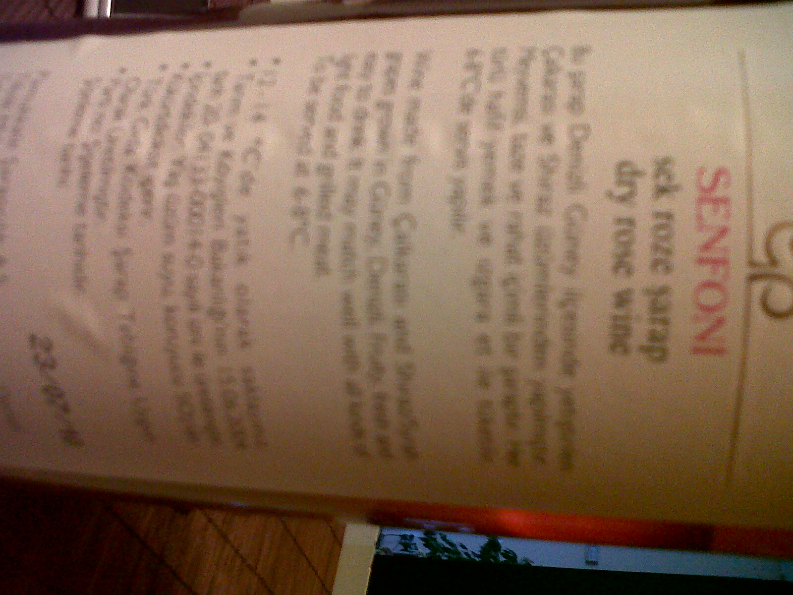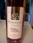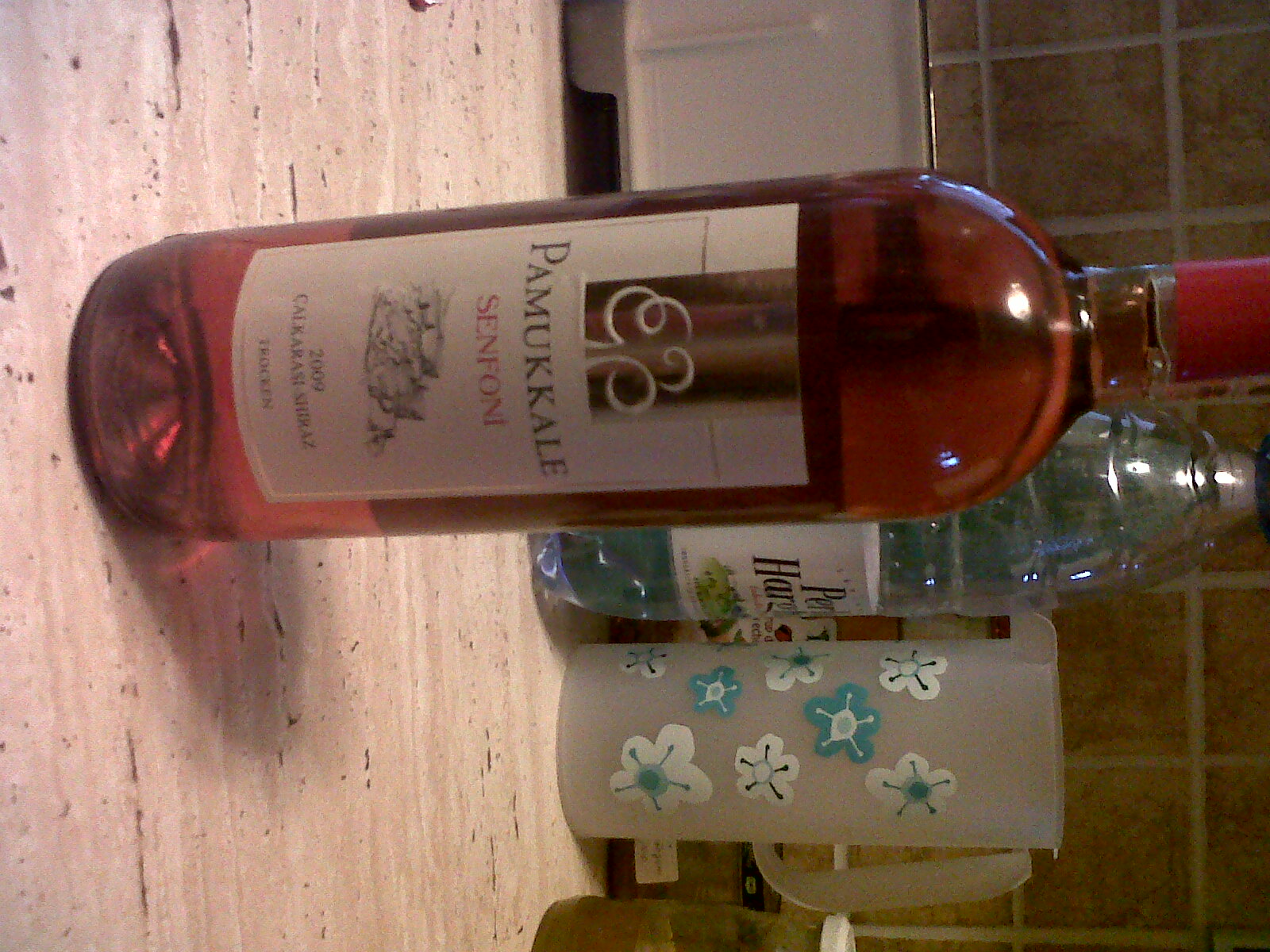 Vin: Rose Senfoni, 2009, sec („trocken” pe eticheta, adica „sek” in turceste). Cupaj din struguri Shiraz şi Çalkarası, din regiunea Güney, districtul Denizli, Turcia. Producator: Pamukkale Wein GmbH.