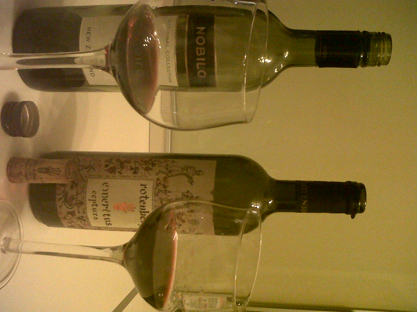 La 10 minute de la deschiderea sticlelor, nasul se prezinta astfel: Nobilo este destul de inchis si domol, cu prune verzi si un iz predominant sarat-amarui, de briza de mare si piatra uda -poate fi o caracteristica a terroirului sau a producatorului (l-am gasit mult mai pregnant si la Sauvignonul Blanc); Emeritus are visina multa, pruna, lemn ud.