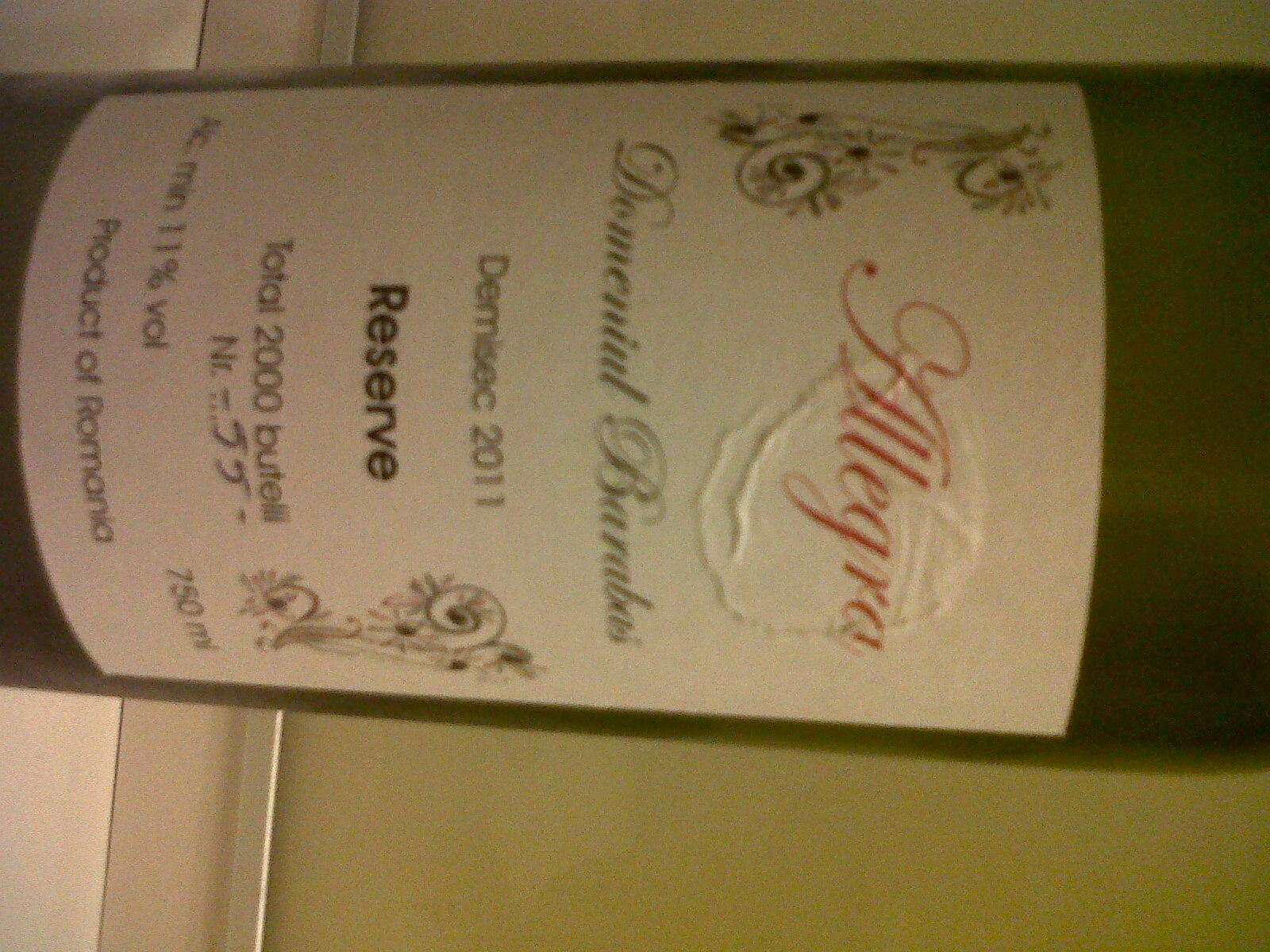 Dar destul cu aluziile si misterul: vinul se numeste Allegra si este un cupaj de Riesling Italian cu Feteasca Alba, productie 2011, 11% alcool, demisec; producatorul se numeste Domeniul Barabas. A fost imbuteliat un lot doar de 2000 de sticle (a mea purta numarul 55), pentru a putea fi comercializat la rafturile unui proiectat magazin de prezentare si desfacere; restul productiei se vinde vrac.