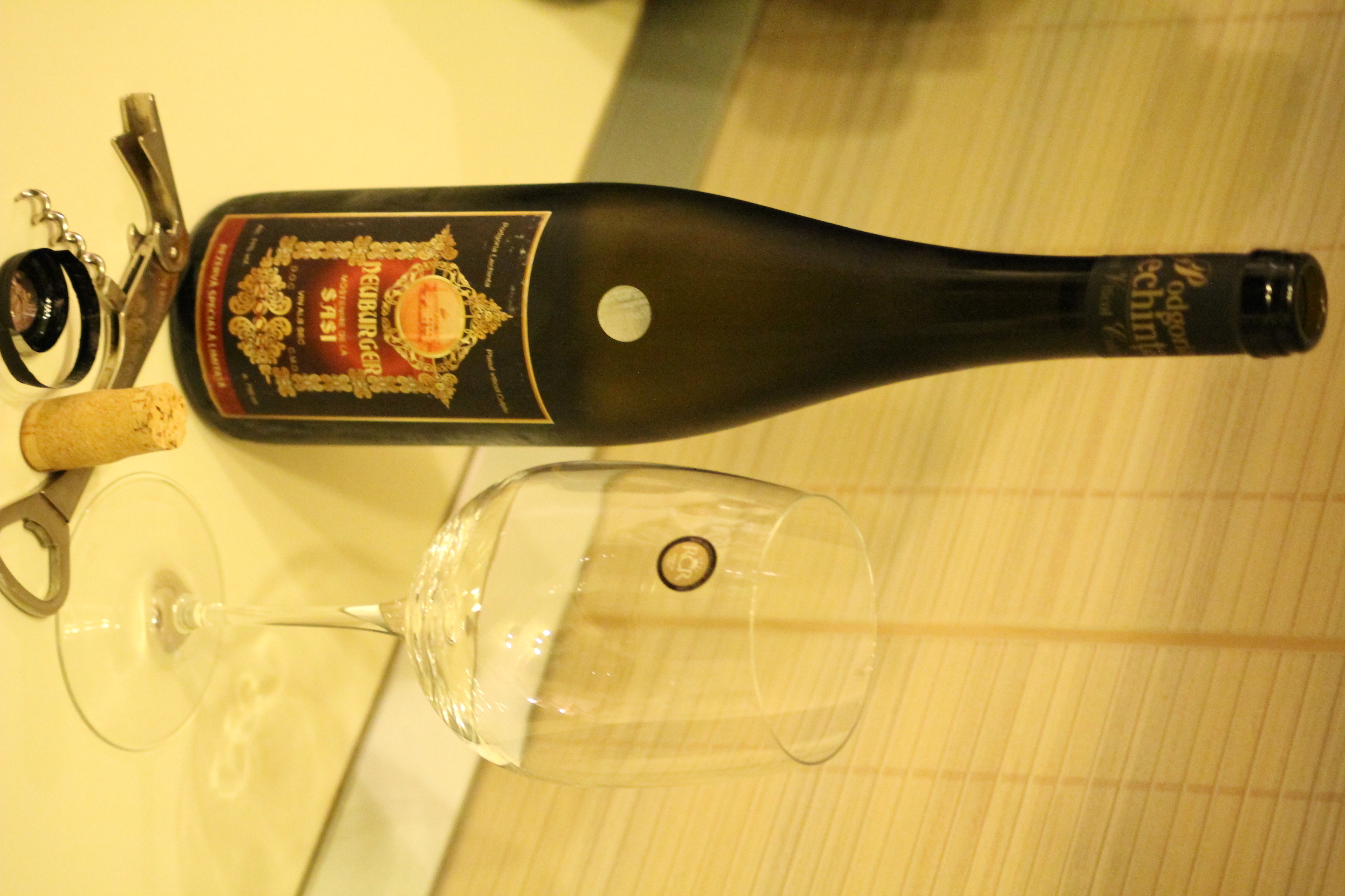 Primul vin este de la un producator consacrat, cel putin in anii precedenti: Podgoria Lechinta de Mures. Vinul m-a atras prin numele si titlul asumat –„Mostenire de la sasi” -o provocare indrazneata. Este din soiul Neuburger, de pe plaiul Culpiu al Lechintei, DOC CMD, alcool 11%, vinificat in 2000 si imbuteliat in …2009. Dupa atatea pretentii enuntate pe cativa centimetri patrati de eticheta, se impunea o analiza mai amanuntita …treaba nemteasca.