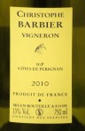 Vinul de fata este Bourboulenc 100% din 2010 cu 13% alcool si vine de la un mic producator local –Domaine de Simonet. Vinul poarta denumirea de origine IGP Cotes de Perignan, iar proprietarul isi inscriptioneaza numele cu mandrie pe contraeticheta si dopul lung de pluta: Cristophe Barbier, vigneron. Totul in aceasta sticla de vin emana grija, atentie la detaliu, si prietenia dintre vie si om: capisonul cu emblema republicii franceze, dopul lung de pluta de cea mai buna calitate, micul sitar cu ciocul lung care pazeste eticheta…