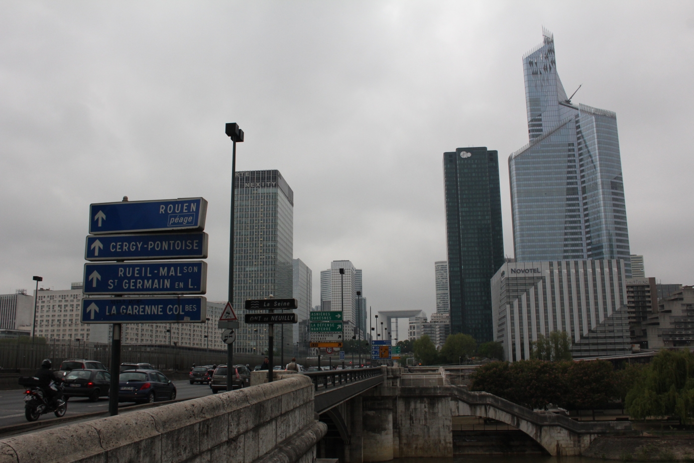 Place d’Etoile, Arc du Triomphe, Champs Elysees, Jardins Tuilleries, Arc du Caroussel -bifate, parcurse si fotografiate constiincios, apoi in fuga spre templu capitalismului si corporatismului national –La Defense. De pe marea esplanada flancata de monstri erecti de beton si sticla, cu arcul de otel in fundal, Turnul Eiffel pare delicat si efeminat, o mica broderie pe un orizont urias. M-a trecut primul fior de emotie autentica pariziana -nu pe poduri sau pe stradute inguste si pietruite, ci in locul acela plin de linii drepte si fara compromisuri.