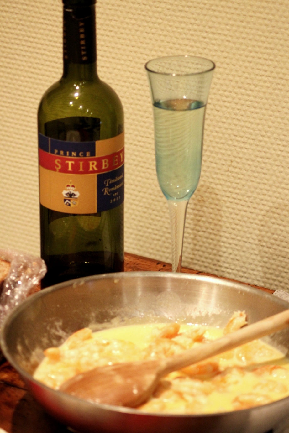 miroasa ca o padurice de salcami, aroma impletindu-se cu cea a untului; am inchis ochii si am inspirat adanc din paharul cu gura ingusta, uitand de ploaia de afara. Verific eticheta scurt: Tamaioasa Romaneasca 2011, Prince Stirbey, sec. Haina galben-aurie a etichetei se potriveste de minune cu cu untul din tigaie; vinul este ceva mai palid la culoare, cam ca si un pergament, limpede si stralucitor.