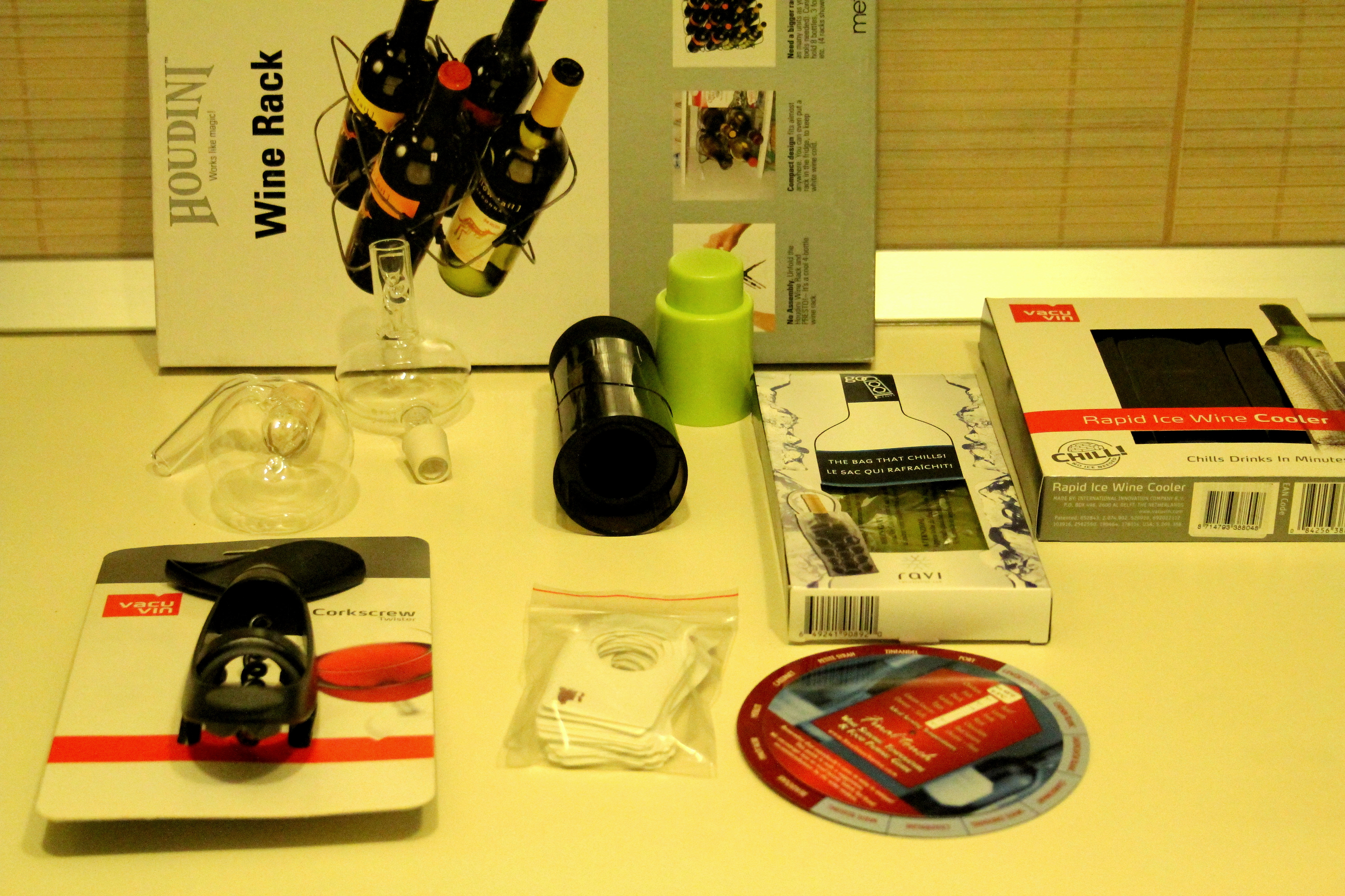 Prin aceasta introducere serioasa am vrut sa transmit bucuria copilareasca a primirii unui set de jucarii -de data asta jucarii pentru oameni (putin mai) mari: accesorii pentru vin. Deocamdata le-am insirat stiintific pe masa, dupa ce le-am intors doct pe toate partile.