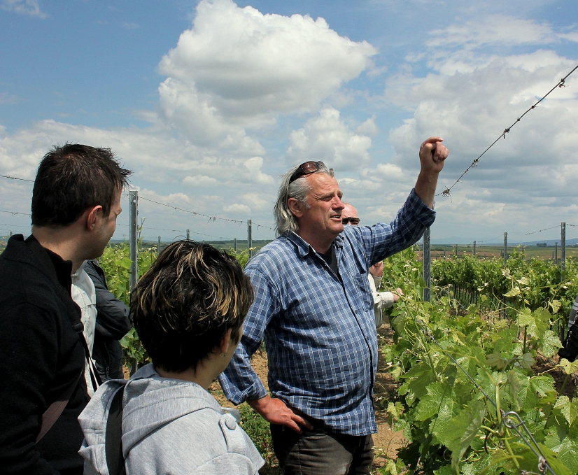 Parcurgand putin drumul invers al vinului, ajungem in vie. Cele aproximativ 20 de hectare cultivate sunt raspandite in mai multe parcele, unele pe coama dealului, altele pe pante moi, abia rotunjite. Unele sunt mari si compacte – randurile de Cabernet si Merlot  au fost printre primele soiuri plantate la Nachbil; vizavi, deste drumeagul de tara stau cateva randuri de Chardonnay june, aflat abia in al doilea an de viata; acesta va avea o copilarie scurta, caci rodul este vinificat inca din al doilea an. In drum spre parcela de Shyrah, aflata pe la mijlocul muchiei dealului, aflam ca pamantul si via muncesc alaturi de om pentru crearea vinului: greutatea si afanarea solului trebuie sa puna in valoare elementele chimice ale acestuia, care trebuie sa fie compatibile cu portaltoiul viei, care va imprima caracteristicile de crestere si rodire altoiului nobil, care va beneficia de caldura soarelui si racoarea vantului date de inclinarea pantei dealului…