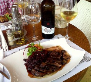 Cu apetitul trezit si pregatit pentru ceva mai serios, am sarit la preparatul -si vinul- de baza: piept de rata cu varza rosie, castane si para caramelizata. La asa o provocare, exista un singur vin pe masura: Solo Quinta 2011, de la Cramele Recas: culoarea aurie plina reflecta fin caramelul din sosul castanelor; aromele de banane coapte, gutui si iasomie dau un aspect elegant verzei inabusite, pieptul fibros de rata este temperat de corpul viguros al vinului, iar postgustul topeste dulceata perelor caramelizate.