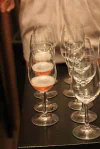 Ca si opening drink am servit spumantul Bendis, spumant rose brut din Pinot Noir. Acesta se pare ca este ultimul dintre vinuri care a calatorit in Italia pentru a doua fermentatie (metoda charmant) si imbuteliere. Cei de la Petro Vaselo vor investi in utilaje proprii pentru productia de vinuri spumante atat dupa metoda italiana cat si cea traditionala, punand astfel controverselor daca spumantul Bendis e un vin romanesc fermentat in Italia, sau un vin italian cu materie prima romaneasca. Ce e sigur e ca bulele sunt italiene, lucru care se observa in pahar prin perlatia abundenta, fina si uniforma. Culoarea roz-violacee, amintind de muscate si petunii, este urmata de un nas discret, cu note de boboc de trandafiri si capsuni; in gura vine in completare si o nota fina de paine proaspata. E un vin vesel, si racoritor, fara profunzime dar cu multa exuberanta. Numele „Bendis”, cu toate explicatiile privind trimiterile la origini dacice si ritualul fertilitatii, nu ma convinge si-mi pare mai mult o gaselnita grabita pentru export. Oricum, vinul e dragut, si sunt promisiuni ca va fi urmat in curand de un frate (sau sora?) mai mare, facut din Chardonnay dupa metoda champenoise. Ar fi o frumosa reusita pentru acest producator, sa fie primul care face vinuri spumante in vestul tarii, folosind ambele metode si soiuri si culori diferite de struguri.