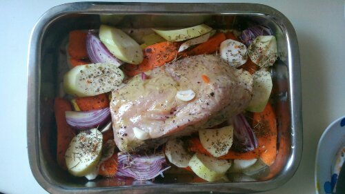 Destul totusi, ca un piept de curcan mediu are cam 4 kg, suficient cat sa hraneasca o masa de familisti cu ocazia Revelionului. Caci dupa o saptamana de slalom printre porcarii de toate felurile, o pauza era mai mult decat necesara, dar n-am avut inima sa ne indepartam prea tare de cuptor. Asa ca am ales pentru masa sarbatoreasca care se intinde pe doi ani o reteta de curcan la cuptor. Retete sunt nenumarate si omniprezente, eu am gasit o reteta simpla de curcan explicita, pe are am adaptat-o evident figiderului propriu: am renuntat la carnati si am adaugat niste dovlecei si un pastarnac feliat.