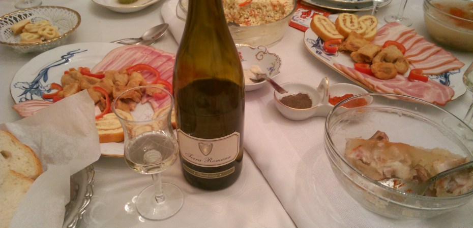 –Terra Romana Chardonnay 2012 a fost vedeta deschiderii mesei, unanim apreciat de bunice si matusi pricepute in ale antreurilor si aperitivelor. Servit bine aerisit, la o temperatura destul de apropiata de cea a camerei (ce vreti, nu mi-am luat toata recuzita cu mine…) s-a potrivit cu toate cele puse in deschiderea mesei: jumari, rulada cu cascaval, piftie, slaninuta cu boia, oua umplute. E suficient de aromat cat sa nu ridice sprancene de mirare („iar imi pui in pahar acrituri de-astea de-ale tale?”), dar are destula aciditate ca sa reziste unui astfel de asalt de proteine si calorii. De finete nu e cazul, ca alaturi de atatea preparate corpolente, e greu sa fii subtil;