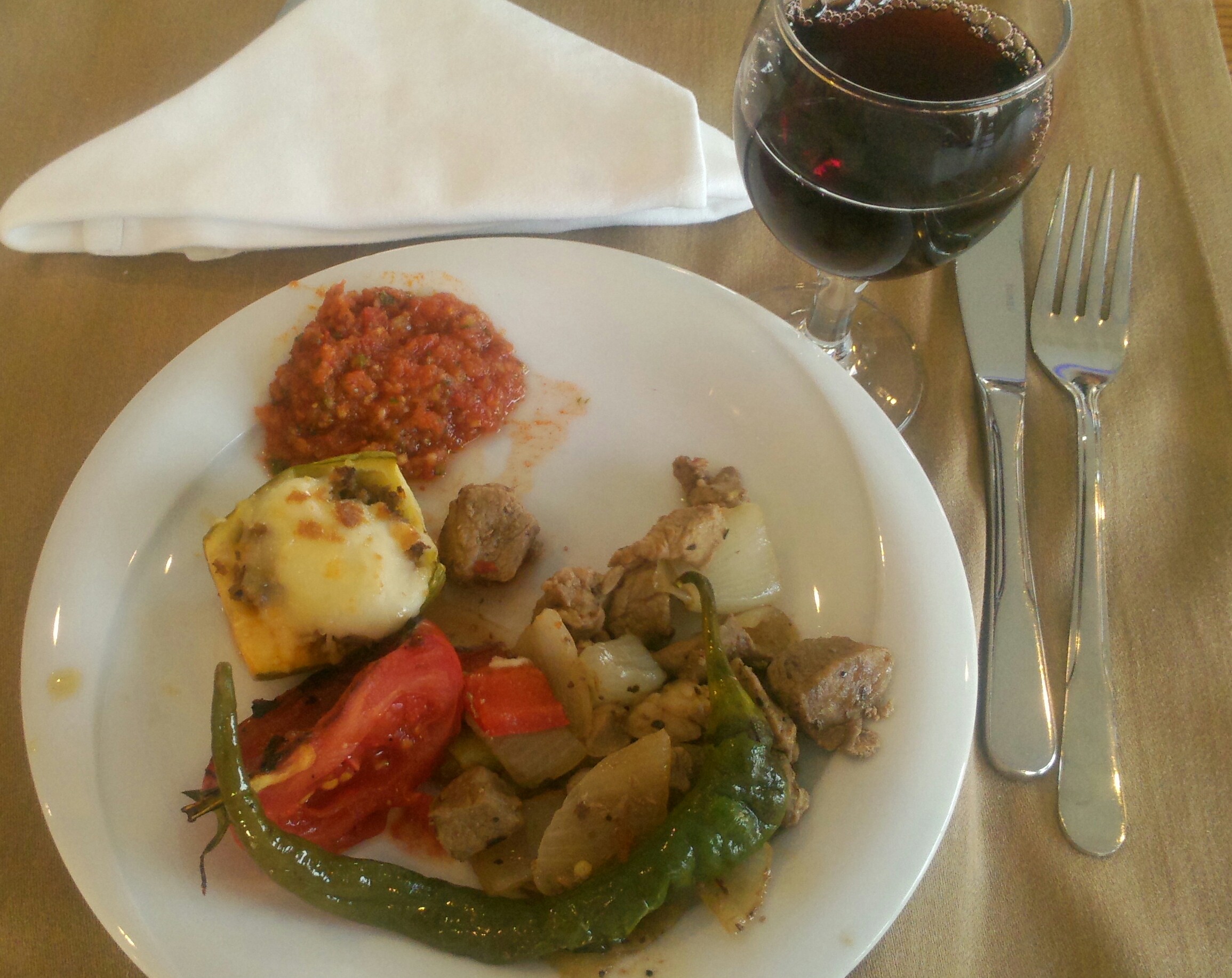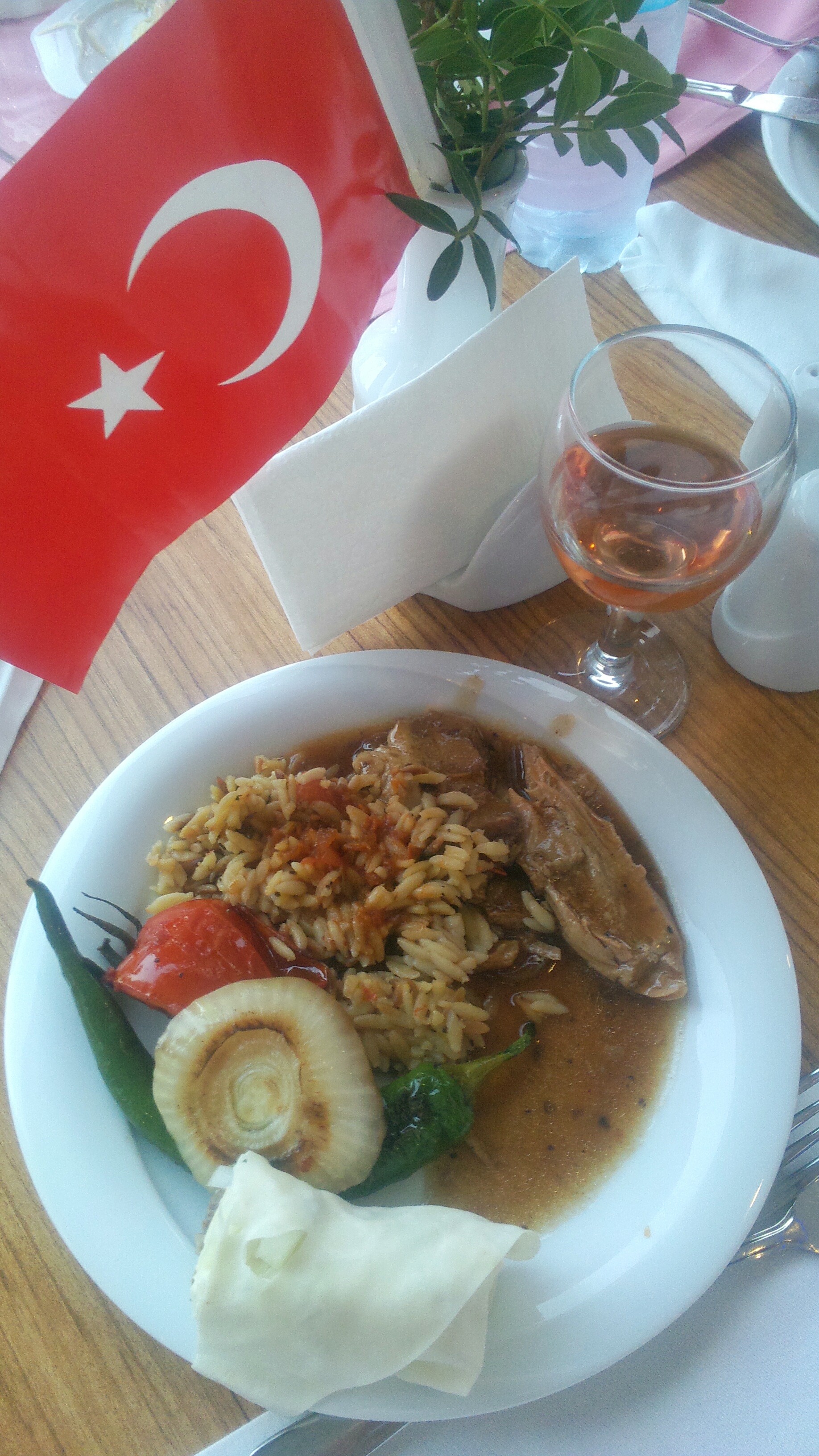 Am avut ocazia sa gustam mai multe preparate din bucataria clasica anatoliana, servite cu toata pompa tinand cont de circumstante, si pot sa va spun ca numai gandul la dieta ce ma asteapta m-a oprit sa fac refill la farfurie de mai multe ori. Mi-a atras atentia o spata de miel, copt in cuptor de pamant, servit cu pilaf dulce cu stafide, si legume la grill, crocante si suculente. Cu rose, bineinteles.