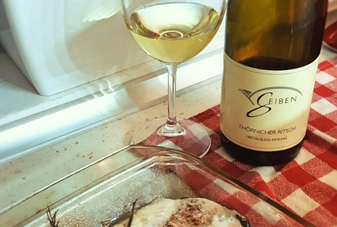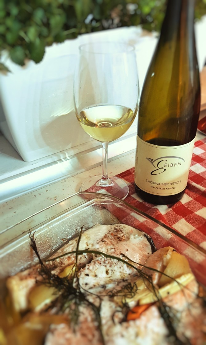 La fel si in farfurie: somonul inabusit la cuptor a atacat agresiv, cu textura carnoasa, cu aromele marine si uleioase, cu notele de ierburi cu care fusese impanat. S-a crezut stapan pe situatie vazand in fata sa un biet vin alb, aparent cam obosit. Nu stia insa ca are de-a face cu un Riesling de Rin, un Thornicher Ritsch din 1997, de la Weingut Geiben. Ce sunt 20 de ani pentru un Riesling bine facut? Abia a trecut de prima tinerete. Asa ca si-a flexat aciditatea, si-a ambalat aromele coapte si invaluitoare, a pus la bataie tot arsenalul de note exotice, textura supla, nervul si mineralitatea. Inghititura cu inghititura a pus la respect pestele, si a ramas stapan absolut al papilelor.