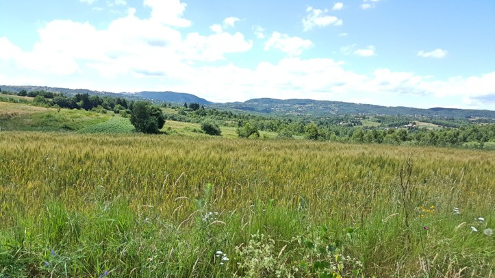 Weekendul trecut am reusit o etapa frumoasa, intinsa pe doua zile, cu un traseu variat, ce a cuprins atat portiuni lungi de plat, pante scurte si abrupte, coborari vijelioase, sau lungi catarari pe serpentine. Am luat drumul spre vest, si dupa inevitabila traversare a orasului (totusi, nu atat de aglomerat pe cat ma asteptam…) si a suburbiilor, m-am intins la sosea, si am infruntat un vant constant din fata, ceea ce mi-a incetinit considerabil ritmul, si am acumulat oboseala in picioare. Obstacolul principal -urcarea de pe dealul Dumbravii- a fost depasit cu brio, iar panorama din varf m-a rasplatit pe deplin. Dar urcarile nu s-au oprit aici, caci odata trecut am luat drumul de la Izvorul Crisului spre Manastireni si Rasca, un drum extrem de pitoresc, prin inima Tarii Calatei. Dealuri mai moi si mai abrupte, presarate cu fanete si paduri, sate ascunse intre vai ori raspandite pe culmi, turle de biserici iesind ici si colo din livezi, nori alergati pe cer de vantul dinspre munte, curbe iuti, coborari abrupte, urcari scurte si neasteptate -drumul asta e o poveste.