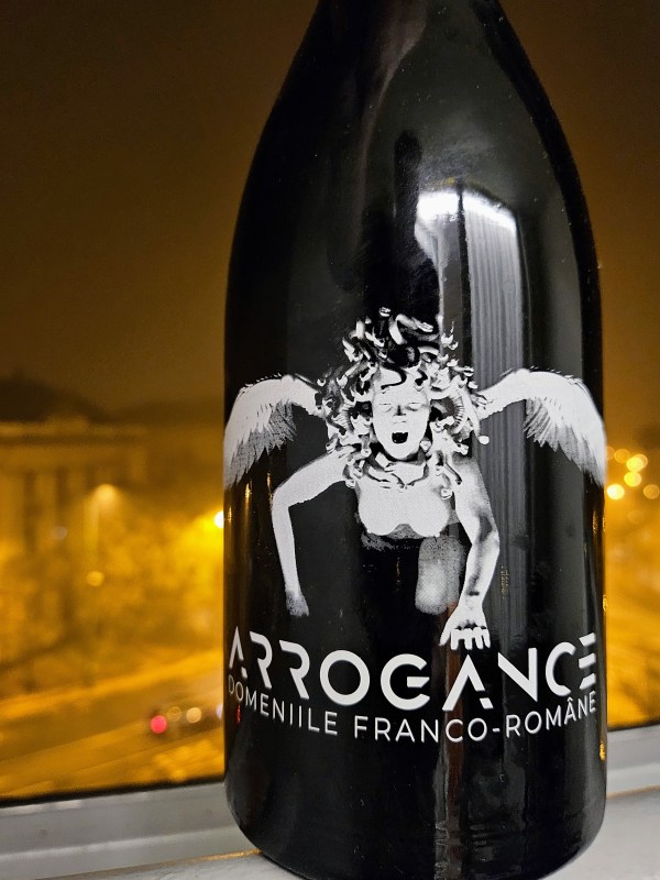 Și pentru că vorbeam de trupe franco-române, am adus cu mine un vin de la Domeniile Franco-Române, cupaj dintr-un soi francez (Merlot) și unul românesc (Fetească Neagră). Ornamentul de pe etichetă se asortează cu cel de pe clădirea de vis-a-vis.