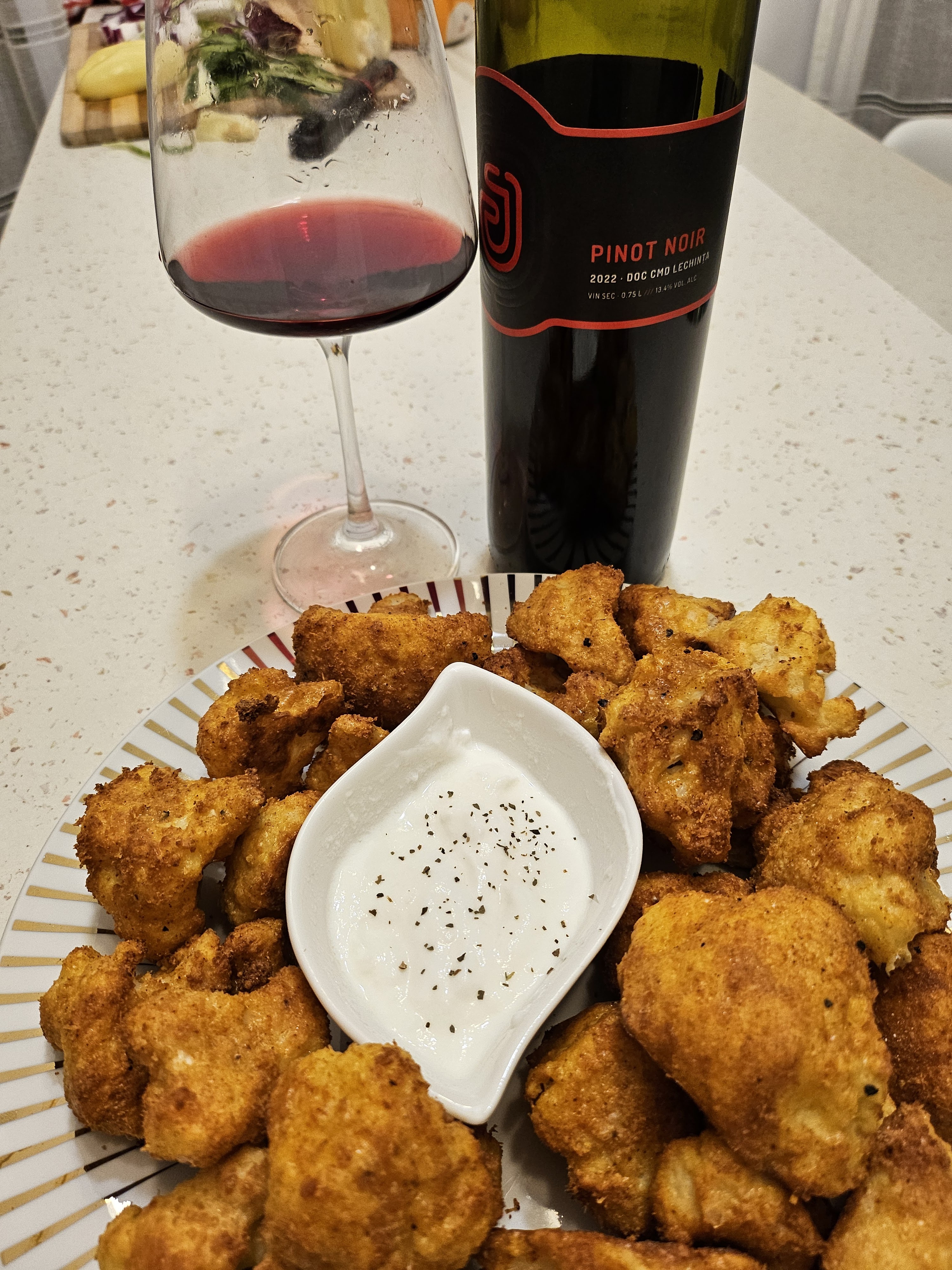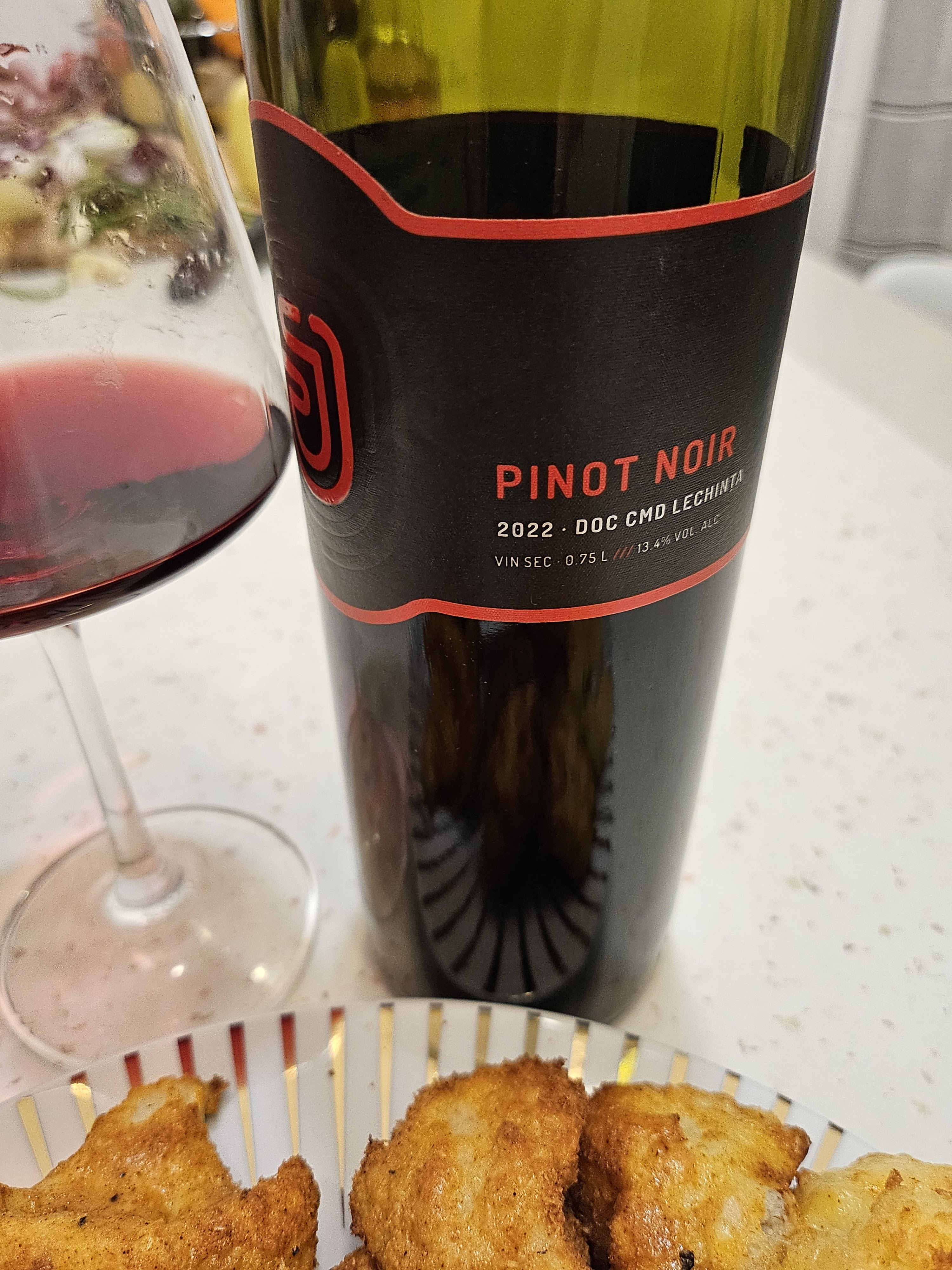 Trecând mai lucruri mai …colorate (nu, nu mai serioase, că și vinul acesta e la fel de jucăuș), ajungem la Pinot Noir. Care are marea calitate că merge servit răcit aproape ca un vin alb. OK, are nevoie de câteva minute în pahar, dar credeți-mă, e crocant, rotund, suplu, cu tanin exact cât trebuie, ceva textură, note de cireșe timpurii, rodie și ice tea. L-am încercat alături de un preparat de vară: conopidă pane cu sos de iaurt și ierburi provensale. Dacă mai rezistă sticla, e bun și a doua zi.