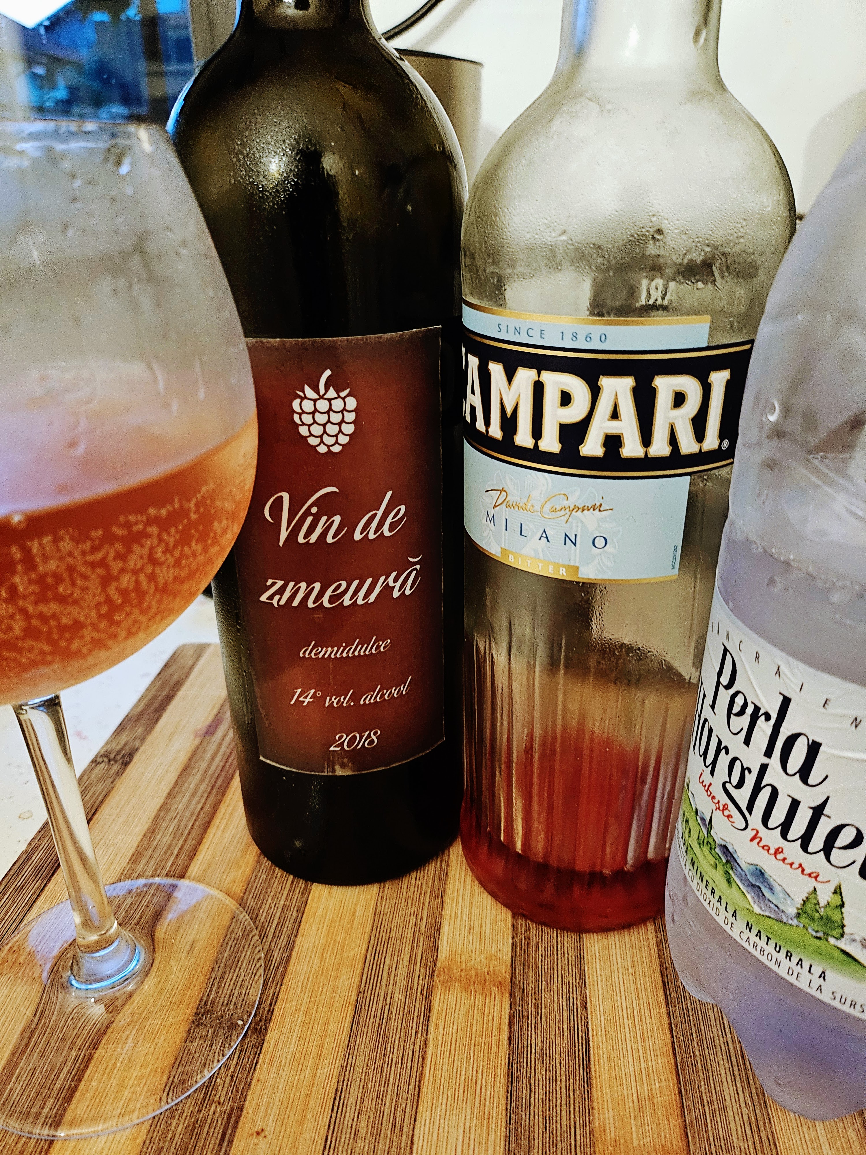 Am găsit printr-un capăt de raft o sticlă căreia în alte condiții nu prea i-aș fi dat multe șanse, mai ales văzând anul de producție și cunoscând condițiile de păstrare: un vin de zmeură. L-am cumpărat înainte de pandemie, la o vizită la Ferma Delicium, probabil împreună cu diferite dulcețuri, siropuri și alte trufandale. Sticla a stat într-un raft, în spatele altor sticle mai mulți ani, până când am descoperit-o acum și am pus-o în frigider. Conform etichetei, e vin din zmeură, produs prin fermentare cu drojdii de vin, demidulce, 14% alcool, producția anului 2018 de la Ferma Delicium (jud. Cluj).