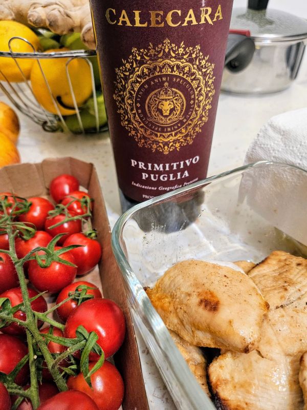 Exemplarul de față de Primitivo vine din Puglia, și merge nespus de bine cu pui în mirodenii și roșii cherry de Puglia.