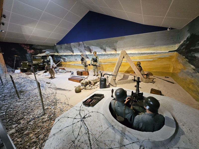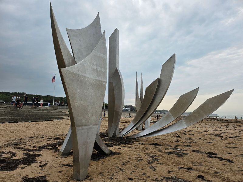 Vorbind de istorie, din Bayeux am făcut un scurt drum până la Omaha Beach. Tot un loc încărcat de emoție, o altfel de emoție…. Cam tot litoralul respectiv e presărat cu relicve ale D-Day, și fiecare sătuc ori faleză are o poveste despre luptele grele duse atunci. Pe plaja numită codificat ”Omaha Beach”, alocată contingentului american pentru debarcare, au fost cele mai grele lupte, fiind nevoie de peste 14 ore pentru a fi stabilizat capul de pod. Acum plaja e tăcută, dar cu puțină imaginațe, poți vedea cazemate și buncăre în locul căsuțelor cochete, avioane în lcul zmeielor și bărci de asalt în locul mormanelor de alge….